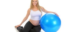 Beautiful pregnant woman sitting with exercise bal. Isolated on white background