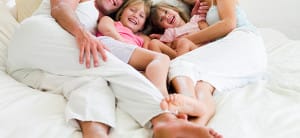 Family lying in bed smiling