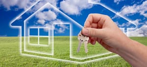 Male Handing Over Keys on Ghosted Home Icon, Grass Field, Clouds and Sky.By GossipSociety / March 16, 2014